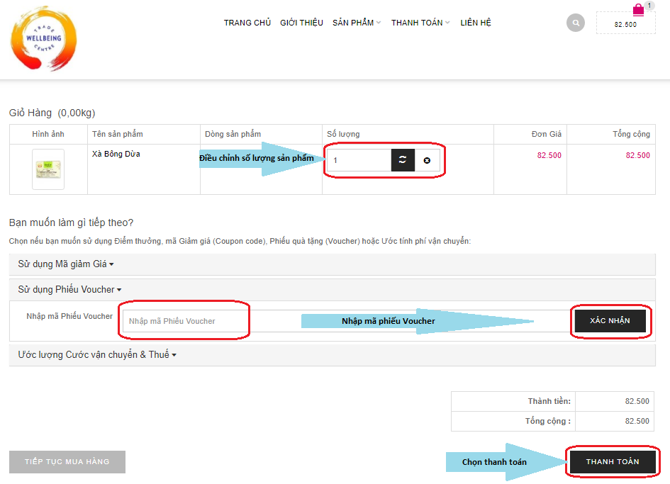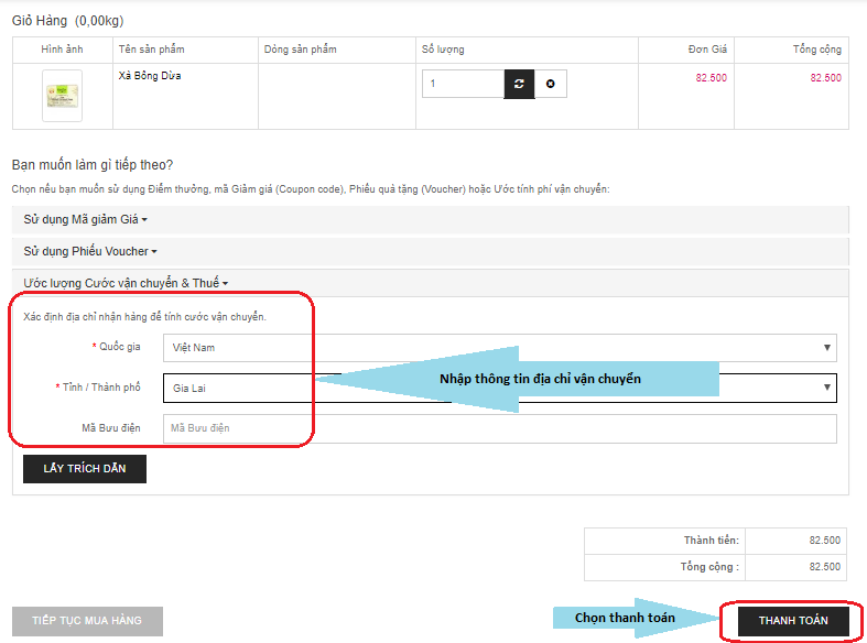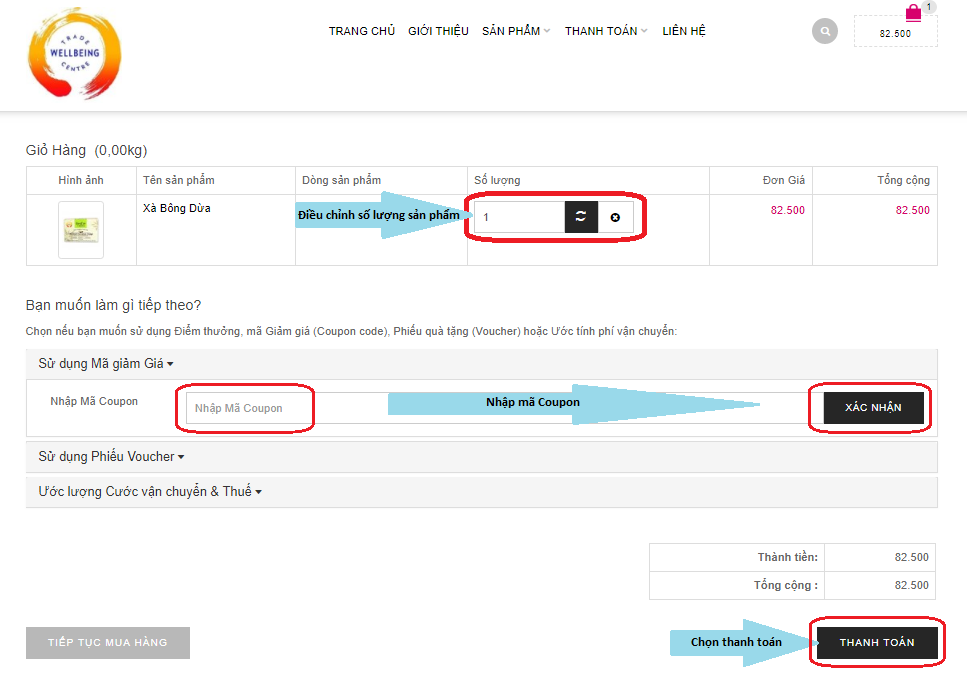 → Bước 6: Tại trang giỏ hàng , quý khách có thể điều chỉnh số lượng sản phẩm, thêm mã coupon, voucher nếu có cũng như phí vận chuyển ,…