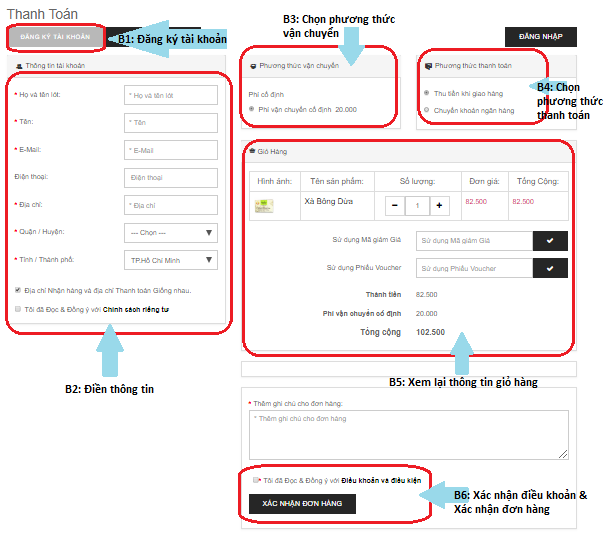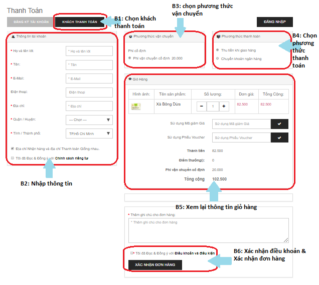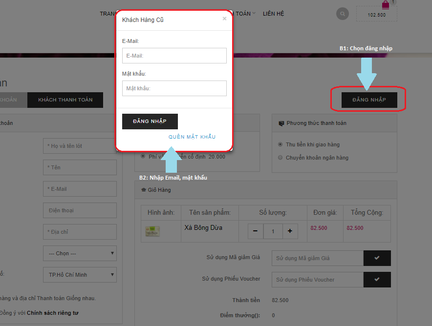 Khi quý khách đã có tài khoản tại trang web của chúng tôi, tại trang thanh toán quý khách có thể dễ dàng thanh toán theo các bước sau: